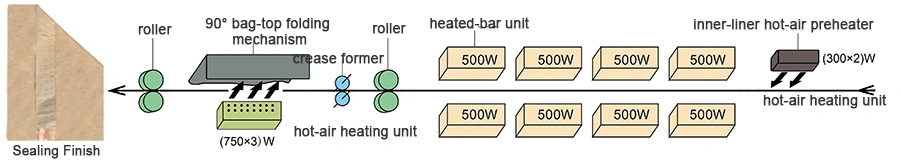 Esta máquina de dobragem superior e selagem com barra aquecida foi concebida para embalar sacos de papel de parede simples ou múltipla com revestimento interno em PE. Ela completa uma sequência de operações através de um controle programado, incluindo selagem térmica do revestimento interno, prensagem do revestimento, corte da parte superior do saco, formação da linha de vinco, dobragem superior, aplicação de uma fita de papel termofusível, compressão aquecida da fita e contagem de sacos. Um módulo de remoção de poeira da parte superior do saco pode ser adicionado quando necessário.